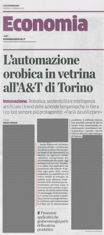 E’ presente anche Elabora nello speciale de L’Eco di Bergamo dedicato alla Fiera A&T di Torino, uno degli eventi più importanti riguardo soluzioni industriali tecnologiche, innovazione e competenze 4.0-5.0.